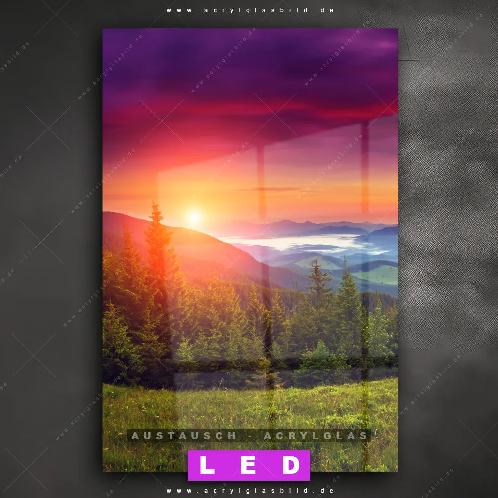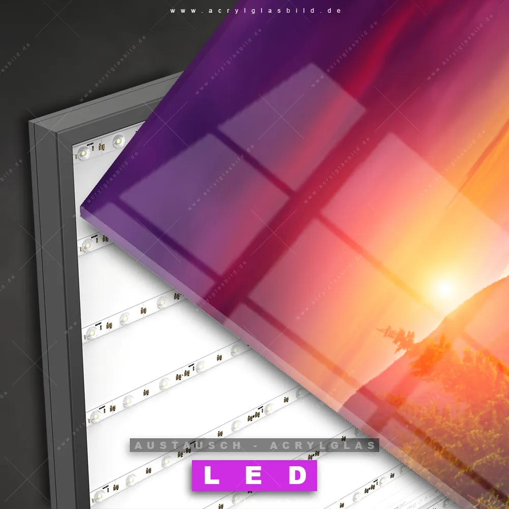 Begriffe wie Wald, Landschaft, Bäume, Natur, Sonnenuntergang, Himmel, Tannen, Sonne haben dich auf der Suche nach deinem neuen Austausch-Acrylglasbild inspiriert? Dann sollte das Wechsel-Acrylglasbild Sonnenuntergang über Waldlandschaft für dein bereits vorhandenes LED Acrylglasbild Canvalight® DIA den Weg zu dir finden.