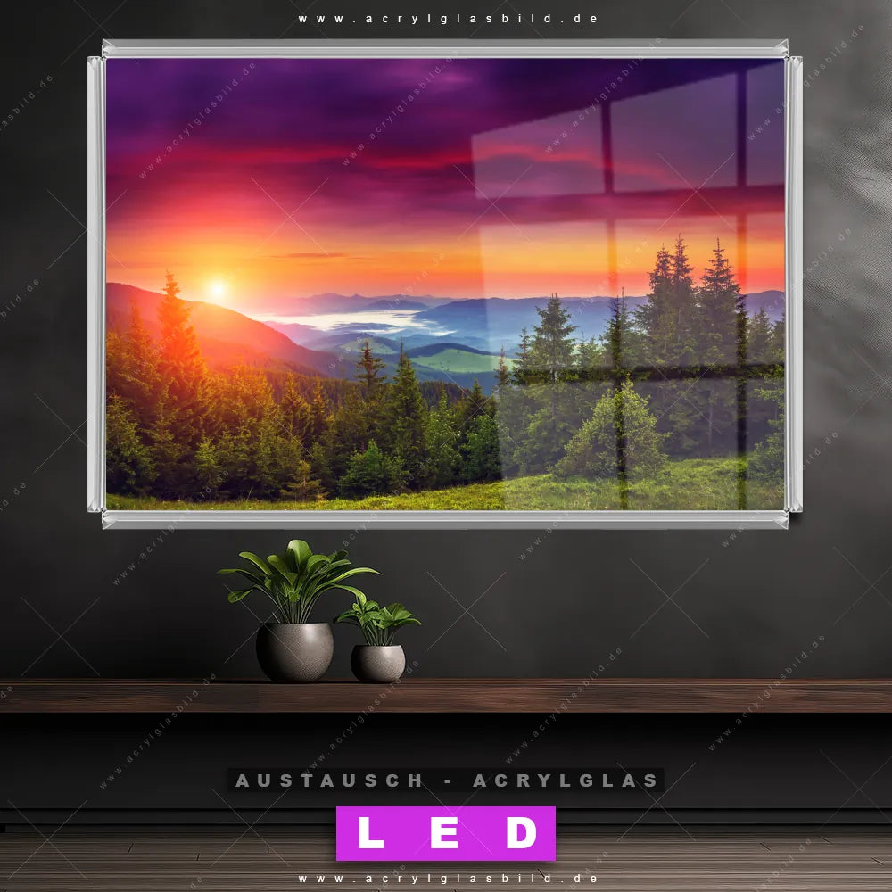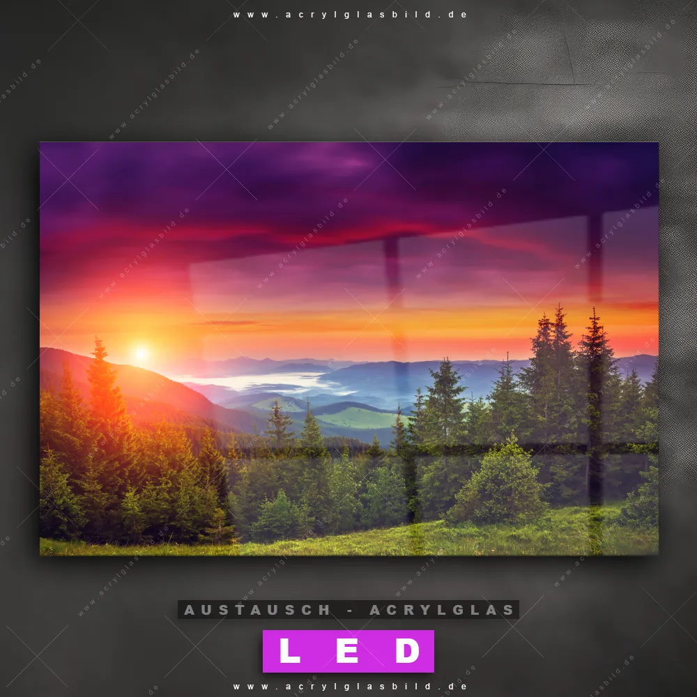 Begriffe wie Wald, Landschaft, Bäume, Natur, Sonnenuntergang, Himmel, Tannen, Sonne haben dich auf der Suche nach deinem neuen Austausch-Acrylglasbild inspiriert? Dann sollte das Wechsel-Acrylglasbild Sonnenuntergang über Waldlandschaft für dein bereits vorhandenes LED Acrylglasbild Canvalight® DIA den Weg zu dir finden.