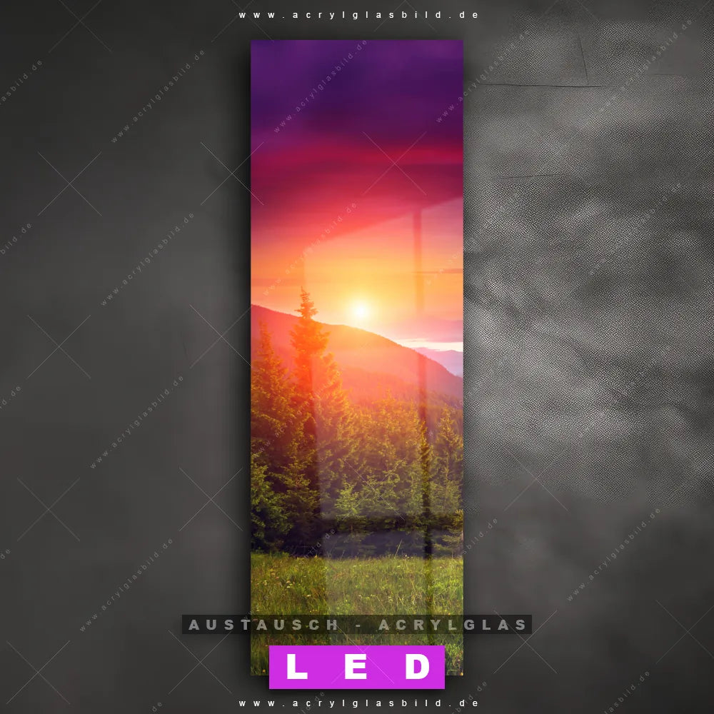 Begriffe wie Wald, Landschaft, Bäume, Natur, Sonnenuntergang, Himmel, Tannen, Sonne haben dich auf der Suche nach deinem neuen Austausch-Acrylglasbild inspiriert? Dann sollte das Wechsel-Acrylglasbild Sonnenuntergang über Waldlandschaft für dein bereits vorhandenes LED Acrylglasbild Canvalight® DIA den Weg zu dir finden.