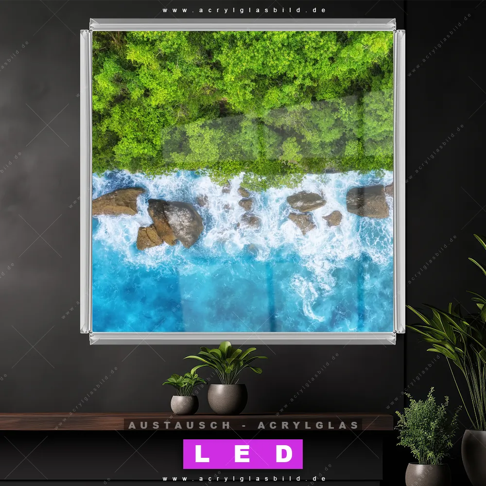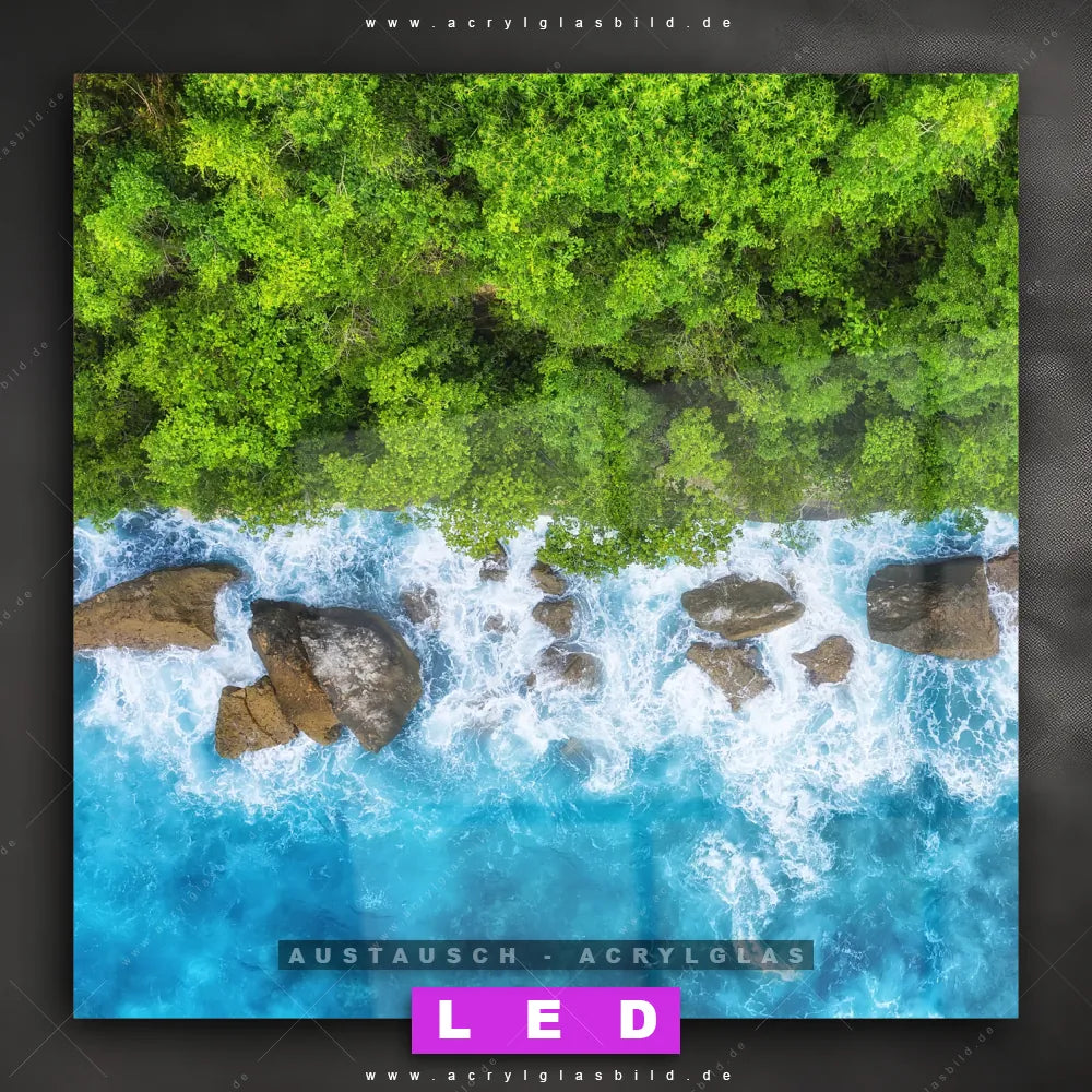 Begriffe wie Wald, Landschaft, Baum, Bäume, Natur, Nadelwald, Laubwald, Meer, Wellen, Felsen, Vogelperspektive, Insel haben dich auf der Suche nach deinem neuen Austausch-Acrylglasbild inspiriert? Dann sollte das Wechsel-Acrylglasbild Wald an der Meeresküste für dein bereits vorhandenes LED Acrylglasbild Canvalight® DIA den Weg zu dir finden.