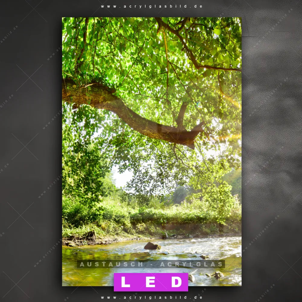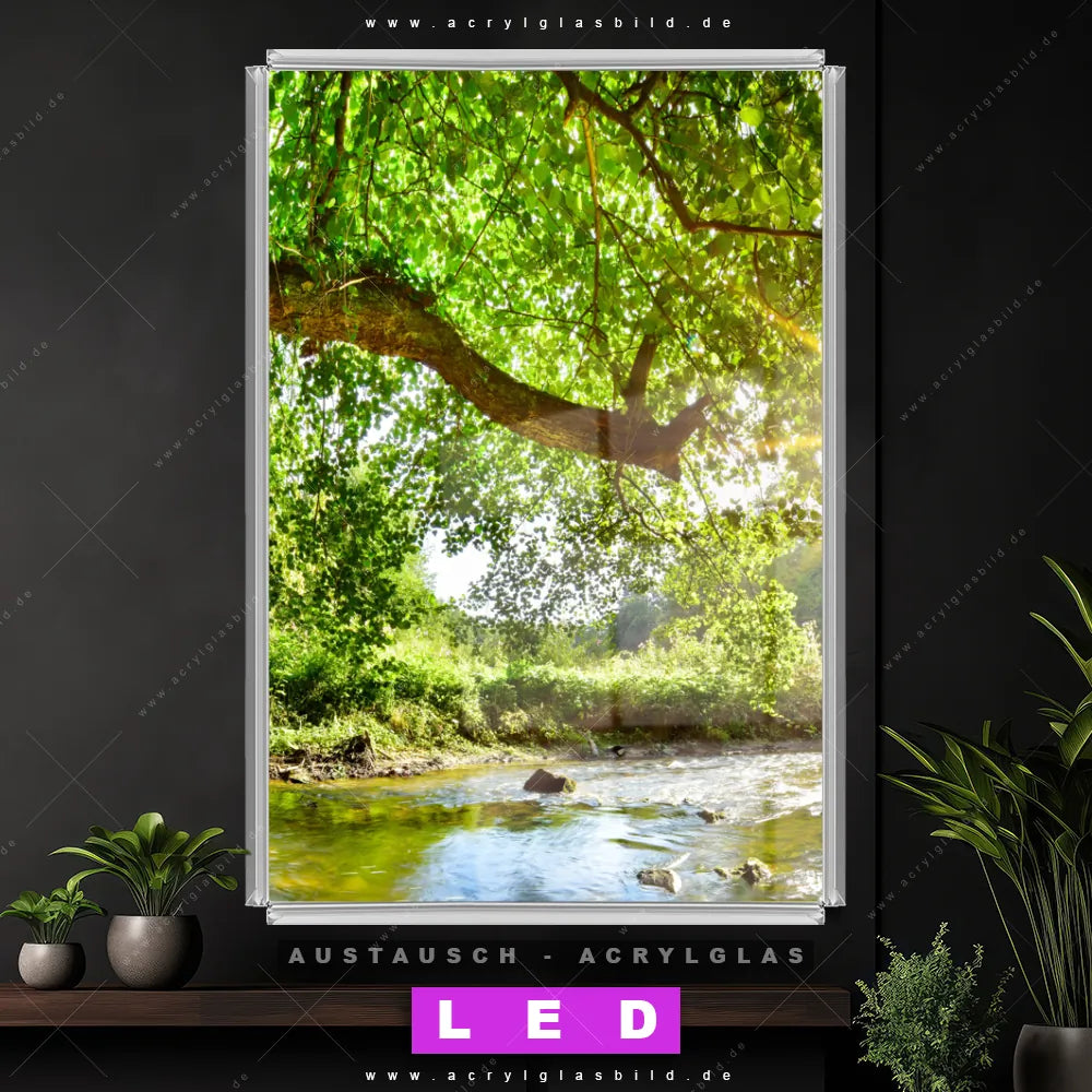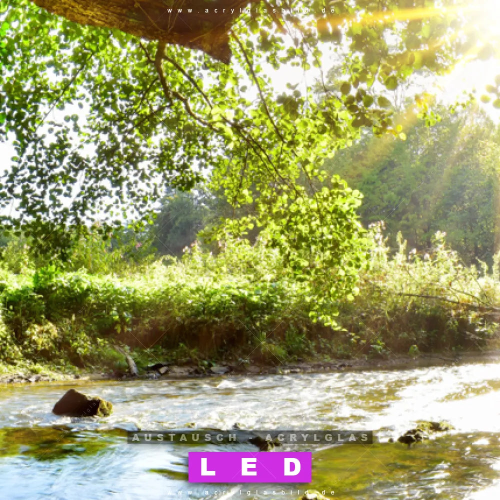 Begriffe wie Wald, Baum, Natur, Sonne, Sonnenstrahlen, Licht, Fluss haben dich auf der Suche nach deinem neuen Austausch-Acrylglasbild inspiriert? Dann sollte das Wechsel-Acrylglasbild Waldpanorama mit Bach für dein bereits vorhandenes LED Acrylglasbild Canvalight® DIA den Weg zu dir finden.