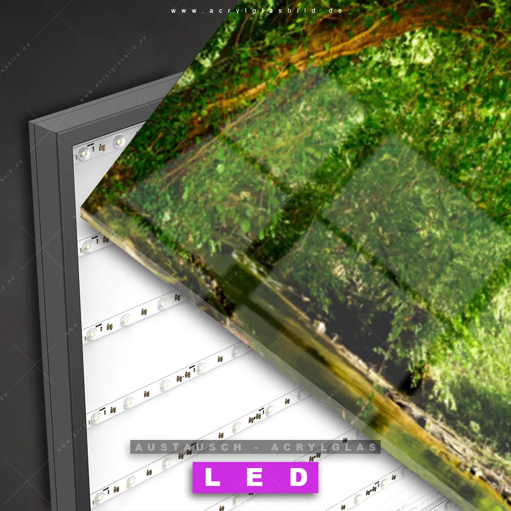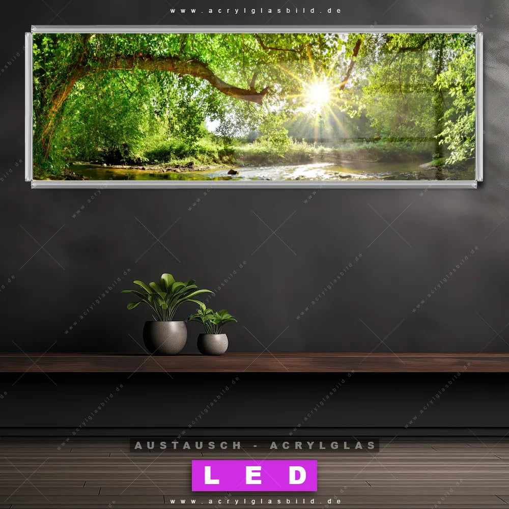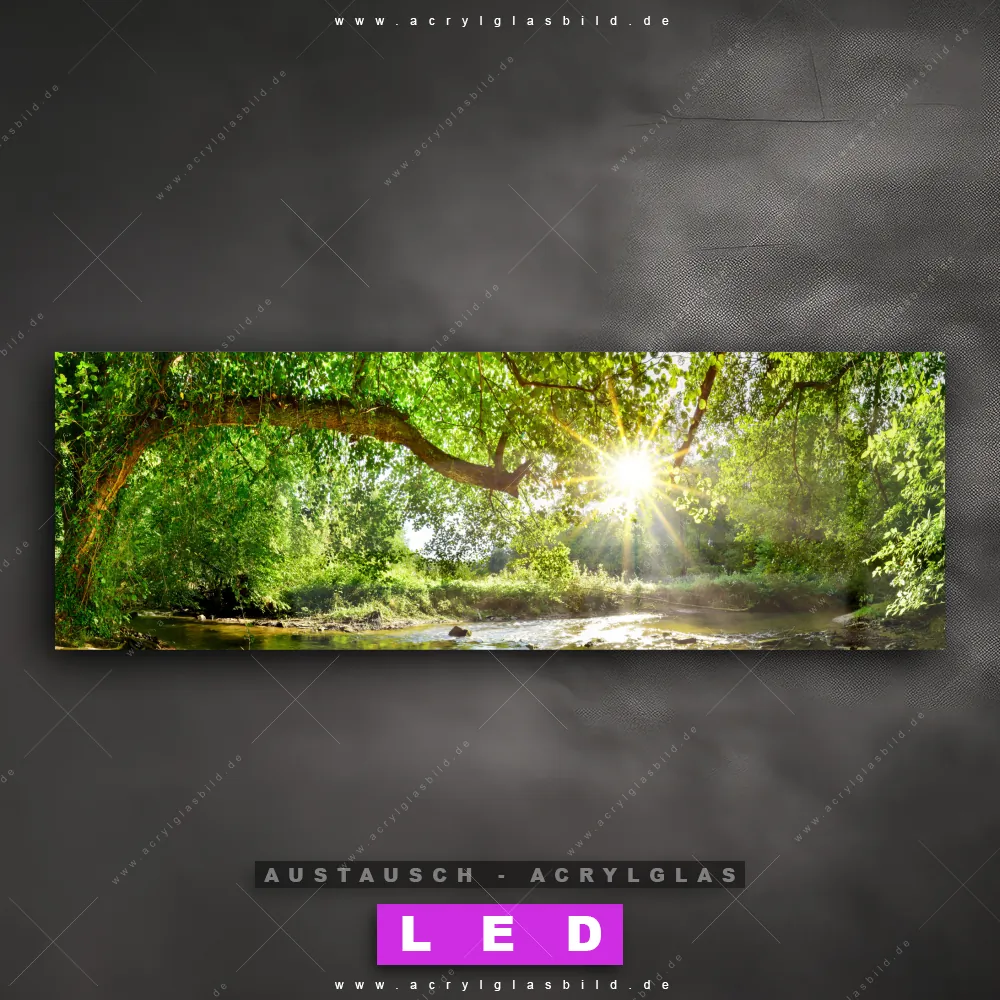 Begriffe wie Wald, Baum, Natur, Sonne, Sonnenstrahlen, Licht, Fluss haben dich auf der Suche nach deinem neuen Austausch-Acrylglasbild inspiriert? Dann sollte das Wechsel-Acrylglasbild Waldpanorama mit Bach für dein bereits vorhandenes LED Acrylglasbild Canvalight® DIA den Weg zu dir finden.