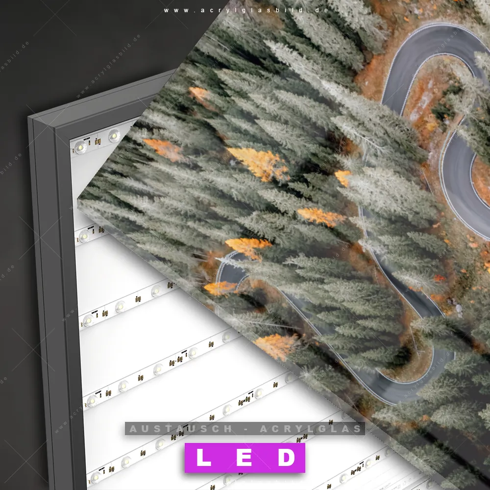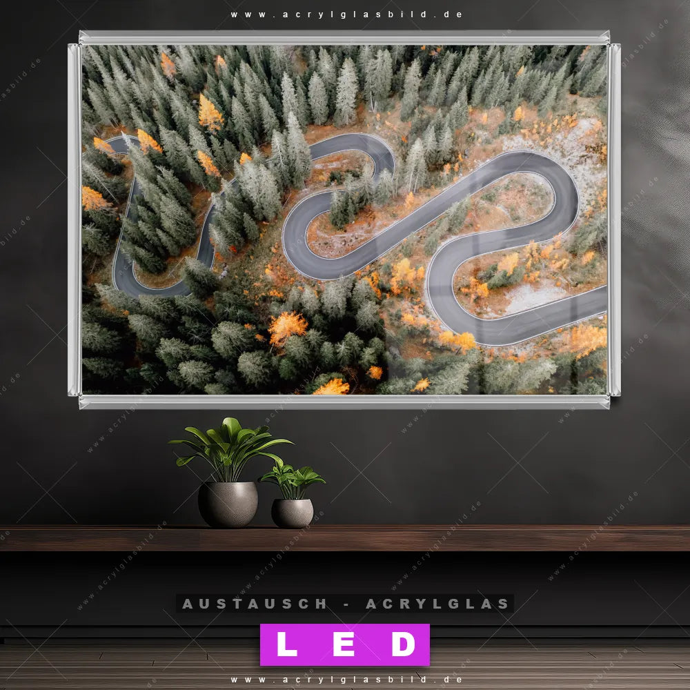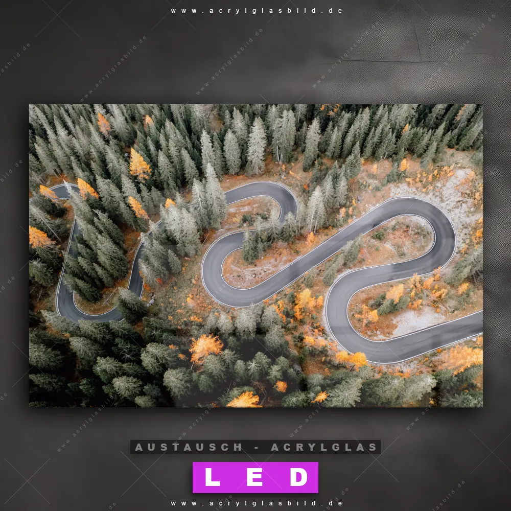 Begriffe wie Wald, Landschaft, Baum, Bäume, Natur, Nadelwald, Laubwald, Felsen, Vogelperspektive, Luftaufnahme, Straße haben dich auf der Suche nach deinem neuen Austausch-Acrylglasbild inspiriert? Dann sollte das Wechsel-Acrylglasbild Straße durch bunte Waldlandschaft für dein bereits vorhandenes LED Acrylglasbild Canvalight® DIA den Weg zu dir finden.