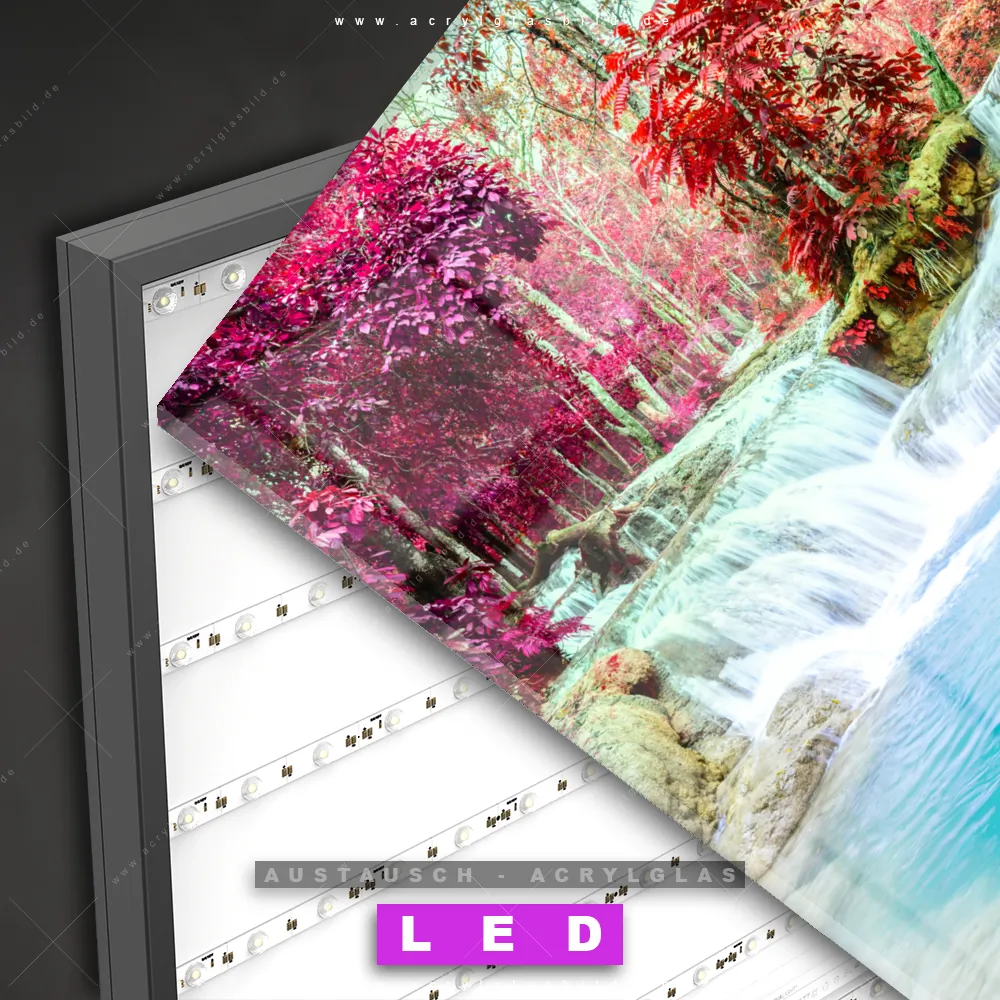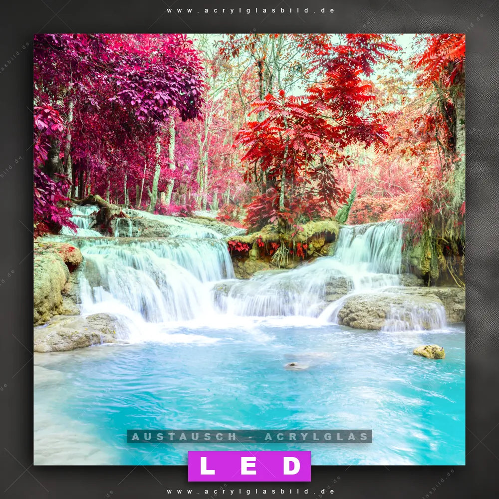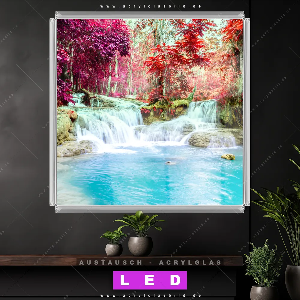Begriffe wie Wald, Landschaft, Bäume, Natur, Baum, Ruhe, Stille, Wasserfall, Fluss, See haben dich auf der Suche nach deinem neuen Austausch-Acrylglasbild inspiriert? Dann sollte das Wechsel-Acrylglasbild Wasserfall im Herbstwald für dein bereits vorhandenes LED Acrylglasbild Canvalight® DIA den Weg zu dir finden.
