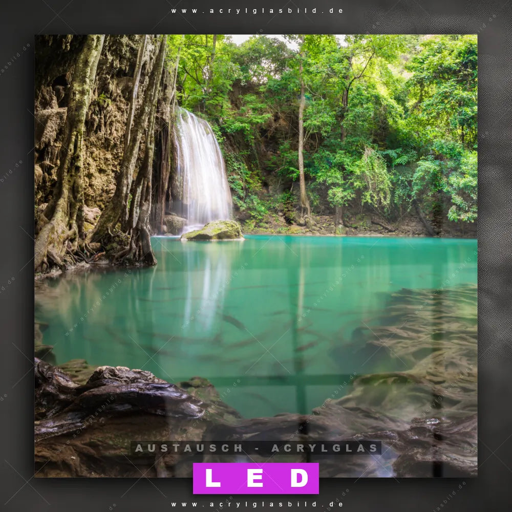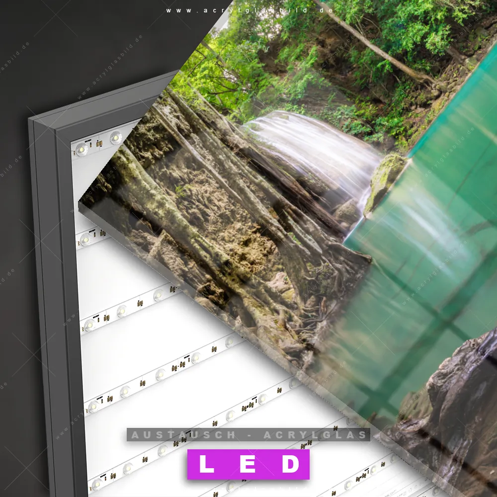 Begriffe wie Wald, Landschaft, Bäume, Natur, Baum, Ruhe, Stille, Wasserfall, Fluss, See haben dich auf der Suche nach deinem neuen Austausch-Acrylglasbild inspiriert? Dann sollte das Wechsel-Acrylglasbild Blick aus einer Höhle auf Wasserfall für dein bereits vorhandenes LED Acrylglasbild Canvalight® DIA den Weg zu dir finden.