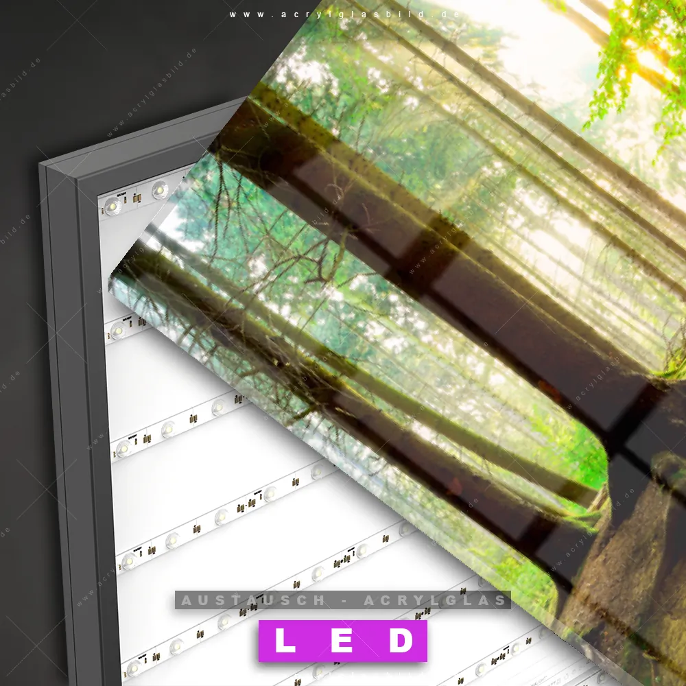 Begriffe wie Wald, Landschaft, Baum, Bäume, Natur, Sonne, Sonnenstrahlen, Licht, Fluss haben dich auf der Suche nach deinem neuen Austausch-Acrylglasbild inspiriert? Dann sollte das Wechsel-Acrylglasbild Bäume im stahlenden Sonnenschein für dein bereits vorhandenes LED Acrylglasbild Canvalight® DIA den Weg zu dir finden.