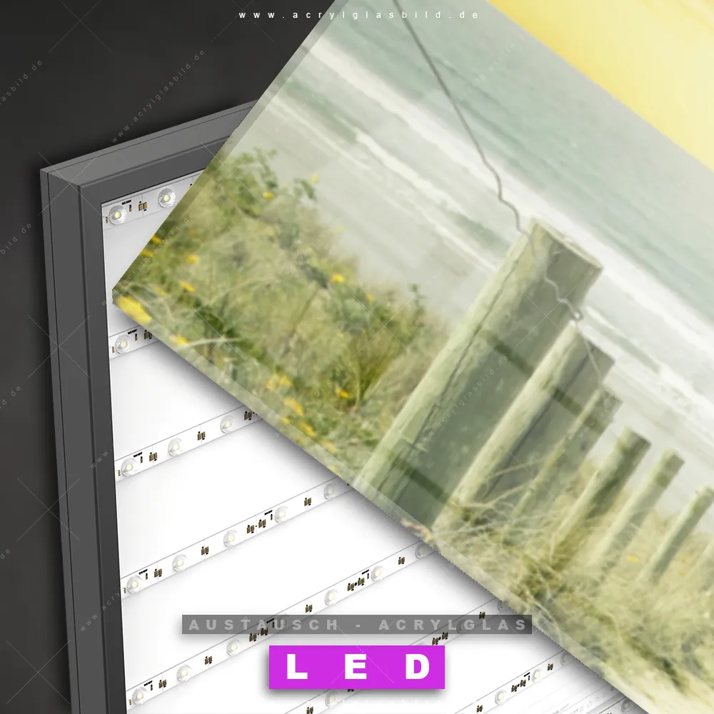 Begriffe wie Steg, Weg, Muschel, Sonnenuntergang - Sonnenaufgang, Ostsee - Nordsee, Urlaub - Reisen, Pier, Deutschland, Sommer, Frühling haben dich auf der Suche nach deinem neuen Austausch-Acrylglasbild inspiriert? Dann sollte das Wechsel-Acrylglasbild Pfad zum Meer für dein bereits vorhandenes LED Acrylglasbild Canvalight® DIA den Weg zu dir finden.