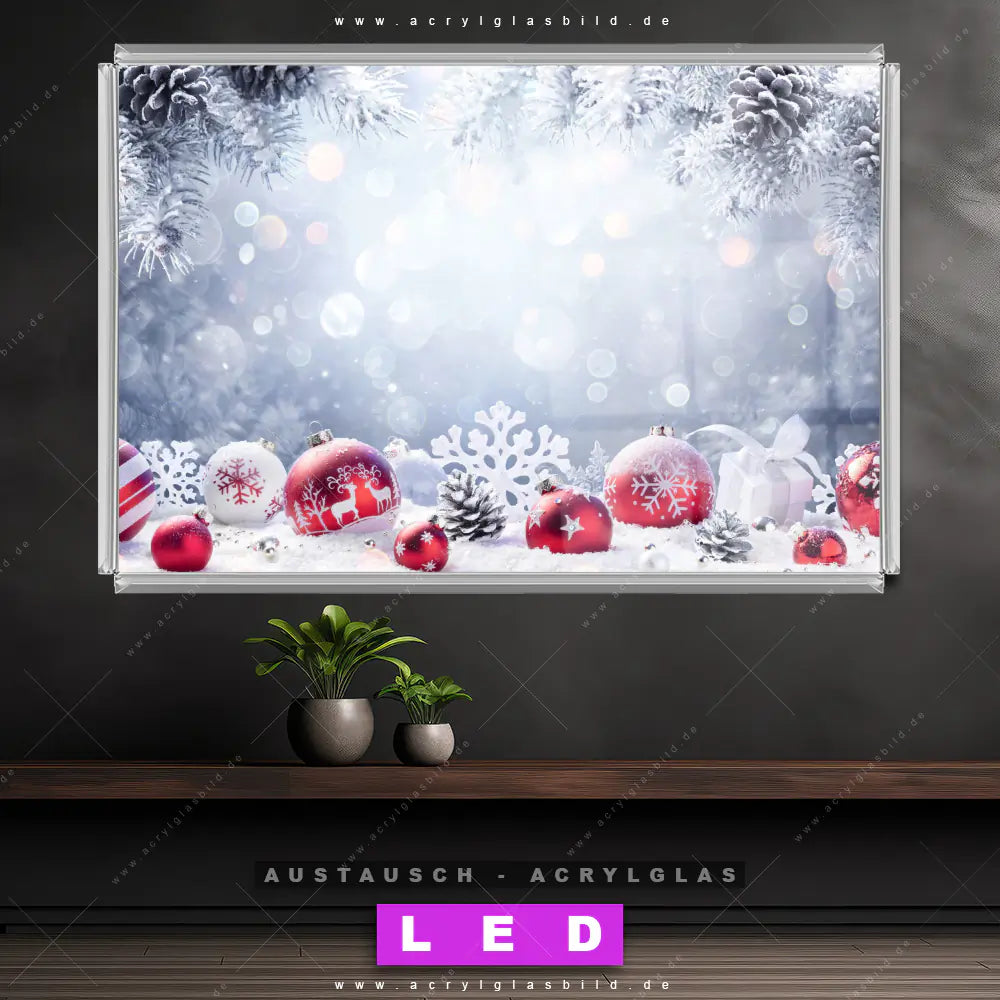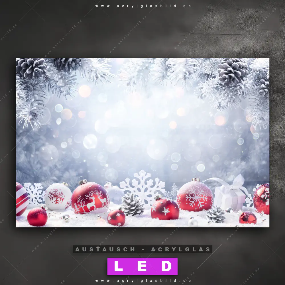 Begriffe wie Weihnachten, Geschenke, Weihnachtskugeln, Christbaumkugeln, Tannenzweige, Winter, Schneeflocken, Schnee, Tannenzapfen haben dich auf der Suche nach deinem neuen Austausch-Acrylglasbild inspiriert? Dann sollte das Wechsel-Acrylglasbild Festliche Christbaumkugeln im Winter für dein bereits vorhandenes LED Acrylglasbild Canvalight® DIA den Weg zu dir finden.