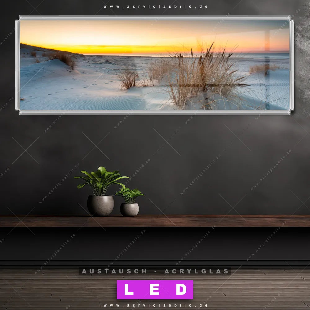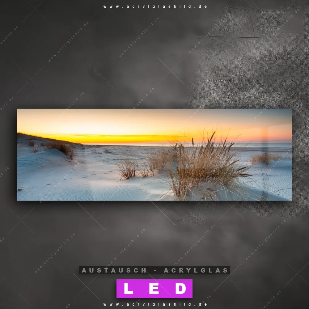 Begriffe wie Deutschland, Sommer, Dünen, Gräser, Sonnenuntergang - Sonnenaufgang, Urlaub - Reisen, Ostsee - Nordsee haben dich auf der Suche nach deinem neuen Austausch-Acrylglasbild inspiriert? Dann sollte das Wechsel-Acrylglasbild Sonnenuntergang über weißen Dünen für dein bereits vorhandenes LED Acrylglasbild Canvalight® DIA den Weg zu dir finden.