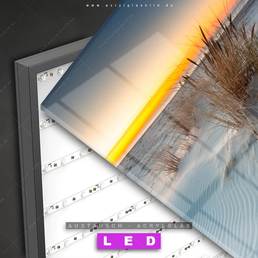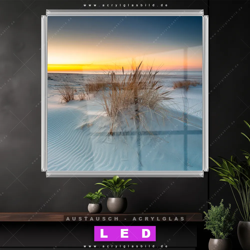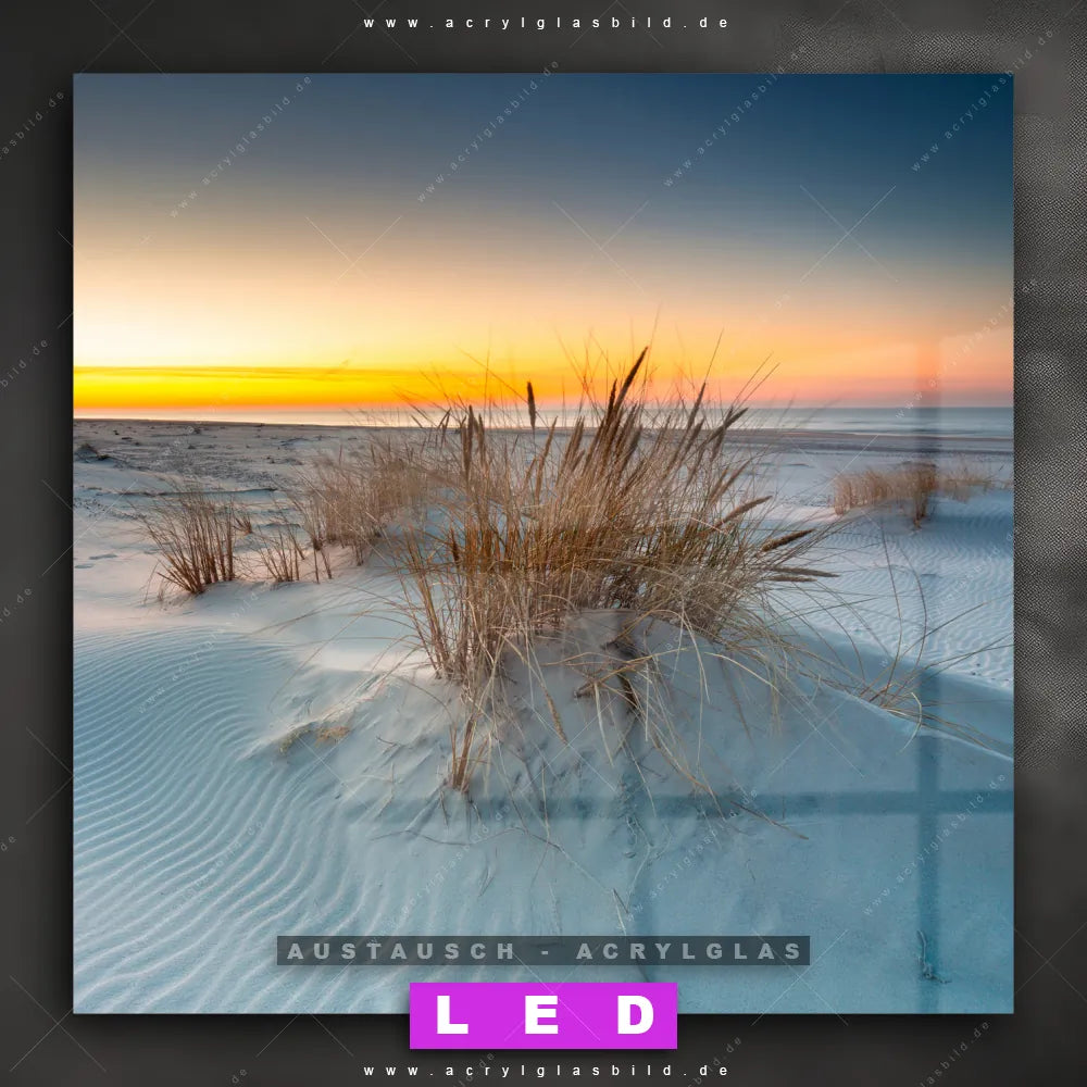 Begriffe wie Deutschland, Sommer, Dünen, Gräser, Sonnenuntergang - Sonnenaufgang, Urlaub - Reisen, Ostsee - Nordsee haben dich auf der Suche nach deinem neuen Austausch-Acrylglasbild inspiriert? Dann sollte das Wechsel-Acrylglasbild Sonnenuntergang über weißen Dünen für dein bereits vorhandenes LED Acrylglasbild Canvalight® DIA den Weg zu dir finden.