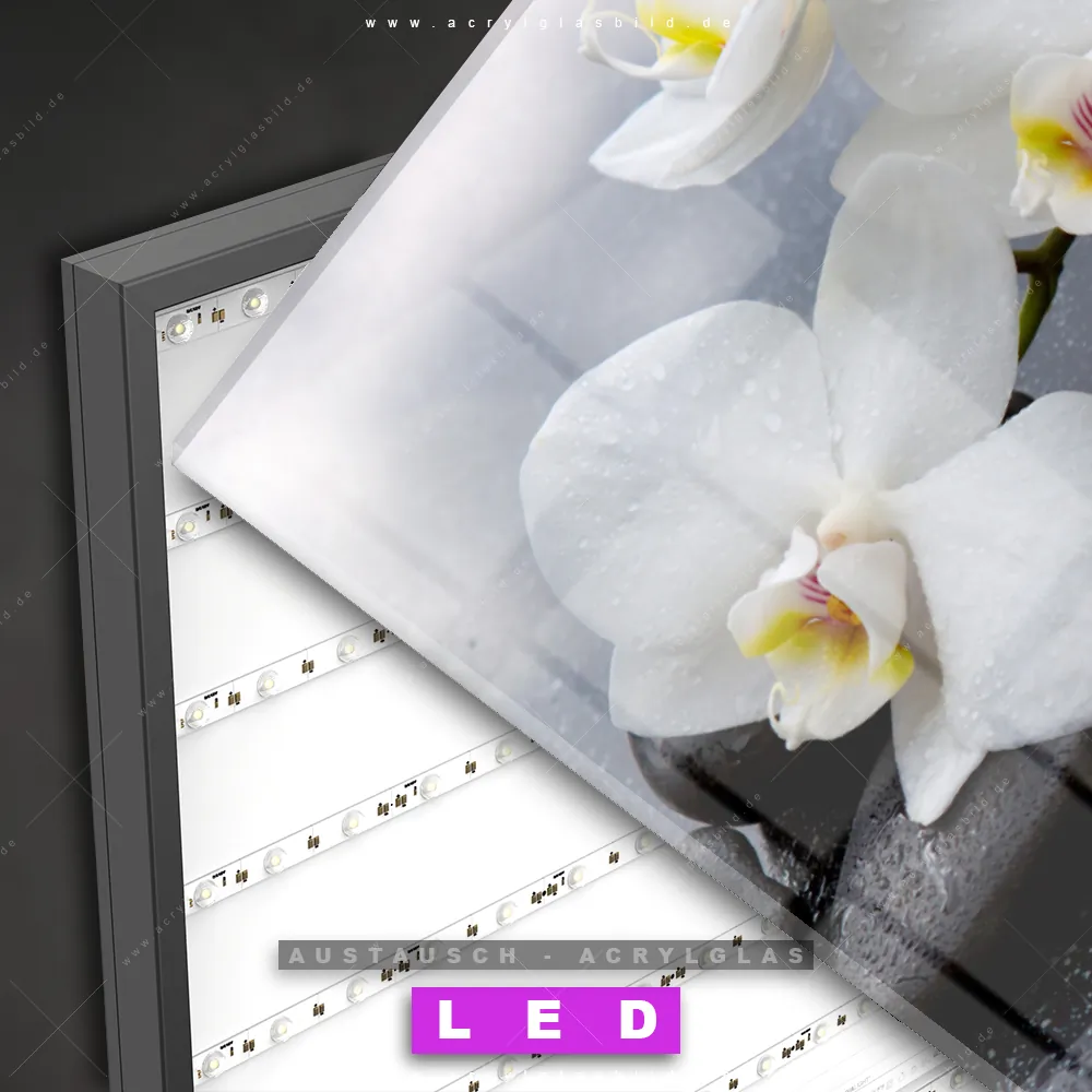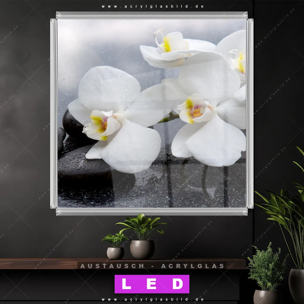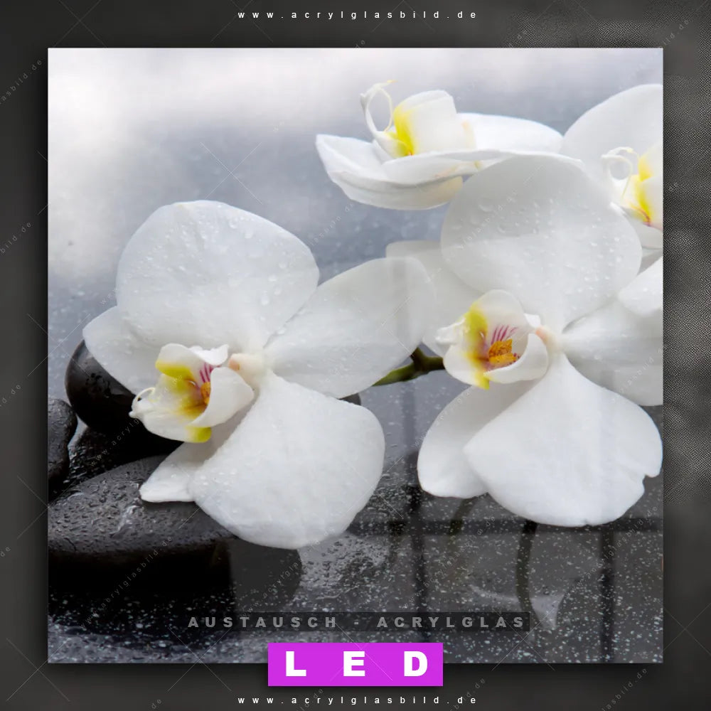 Begriffe wie Zen, Steine, Buddhismus, ausgeglichen, Orchidee, Blume, Blüte, Pflanze haben dich auf der Suche nach deinem neuen Austausch-Acrylglasbild inspiriert? Dann sollte das Wechsel-Acrylglasbild weiße Blüten auf dunklem Stein für dein bereits vorhandenes LED Acrylglasbild Canvalight® DIA den Weg zu dir finden.