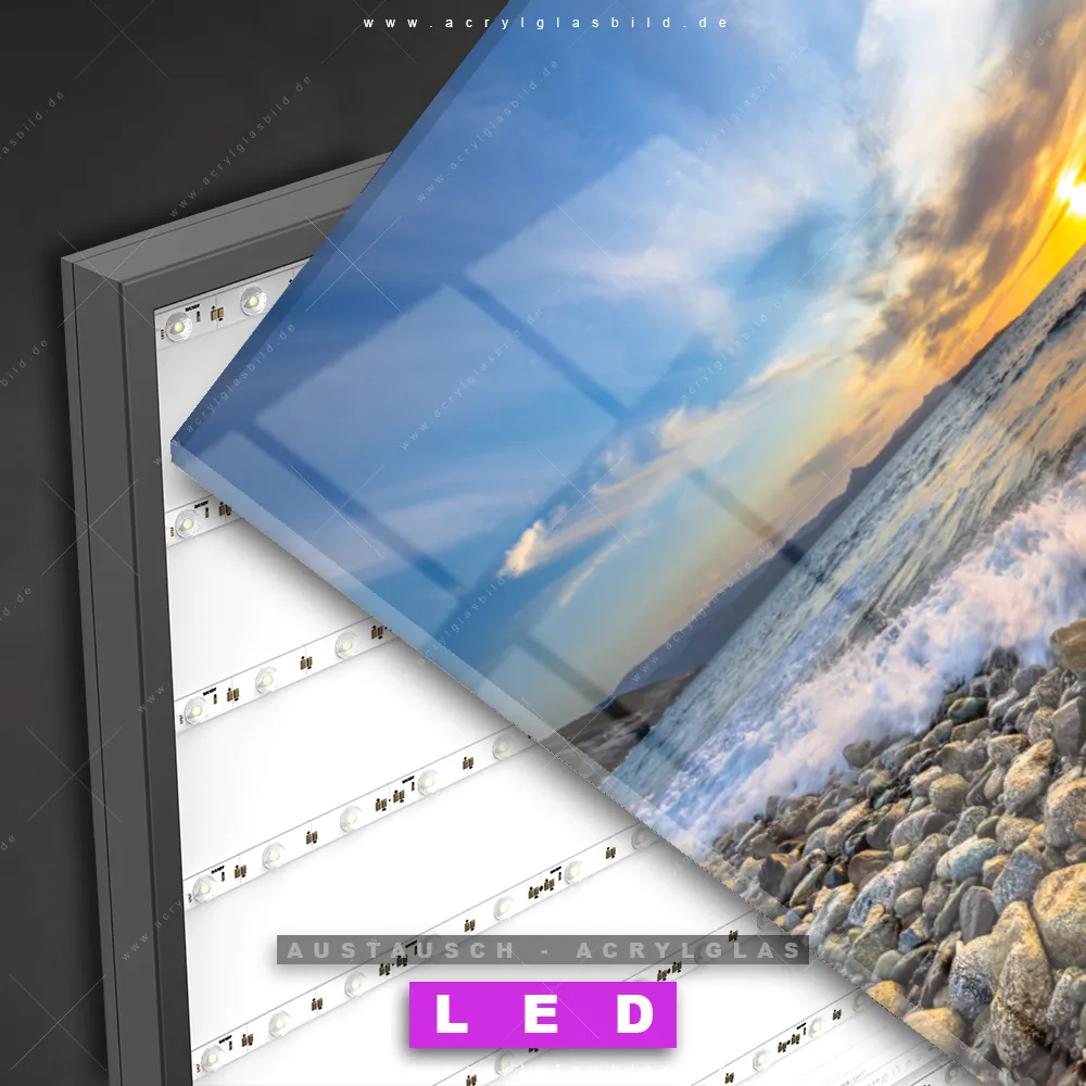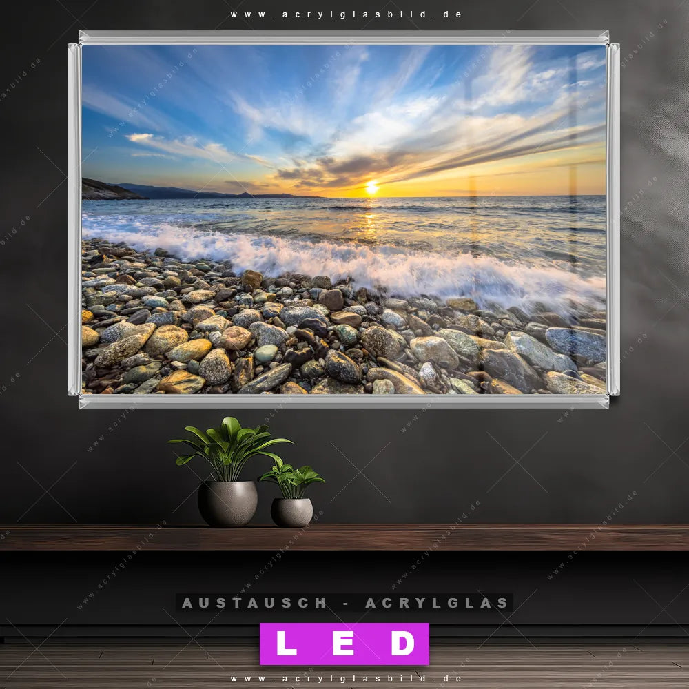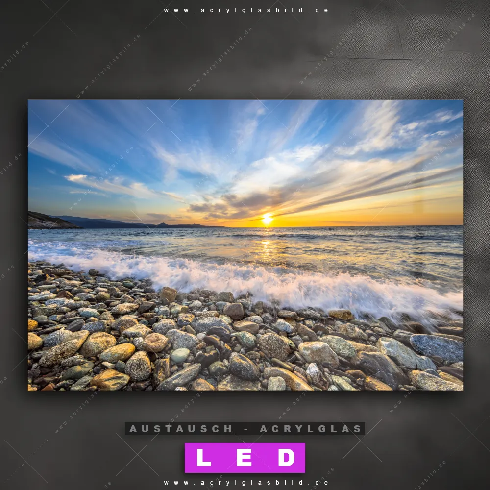 Begriffe wie Küste, Felsen, Sommer, Ostsee - Nordsee, Sonnenuntergang - Sonnenaufgang, Deutschland, Steine, Frühling, Wellen -Surfen haben dich auf der Suche nach deinem neuen Austausch-Acrylglasbild inspiriert? Dann sollte das Wechsel-Acrylglasbild Kiesstrand im Sonnenuntergang für dein bereits vorhandenes LED Acrylglasbild Canvalight® DIA den Weg zu dir finden.
