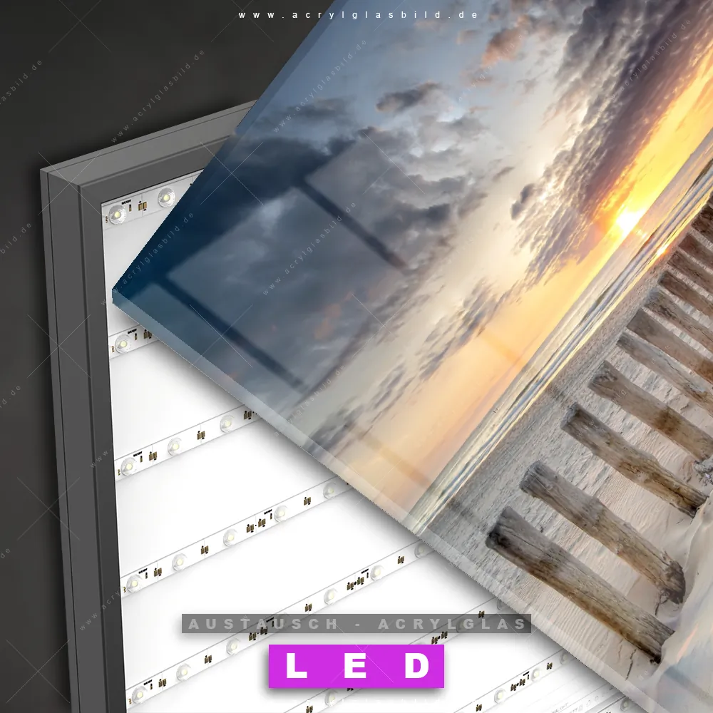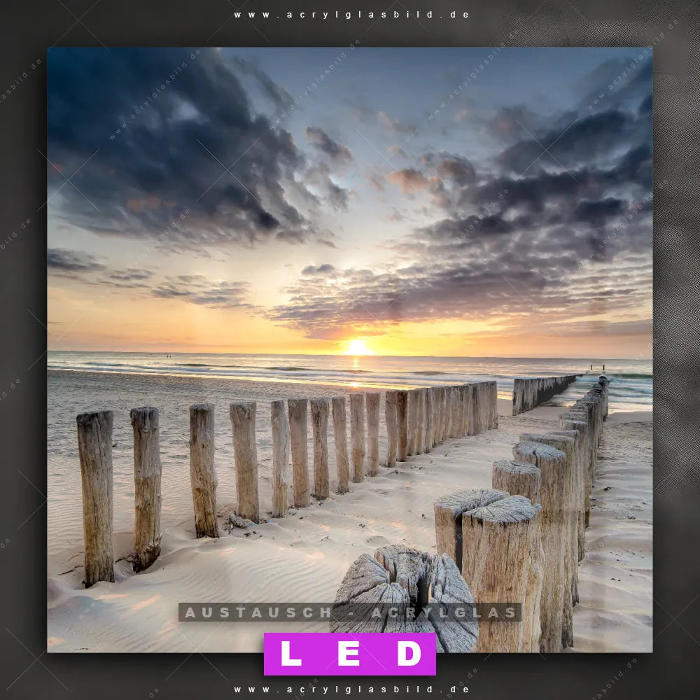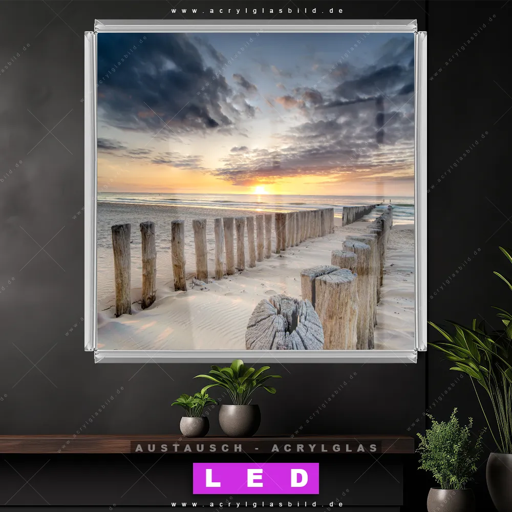 Begriffe wie Deutschland, Herbst, Sommer, Wellenbrecher, Buhnen, Ostsee - Nordsee, Sonnenuntergang - Sonnenaufgang, Urlaub - Reisen, Frühling haben dich auf der Suche nach deinem neuen Austausch-Acrylglasbild inspiriert? Dann sollte das Wechsel-Acrylglasbild Buhne am Meer für dein bereits vorhandenes LED Acrylglasbild Canvalight® DIA den Weg zu dir finden.