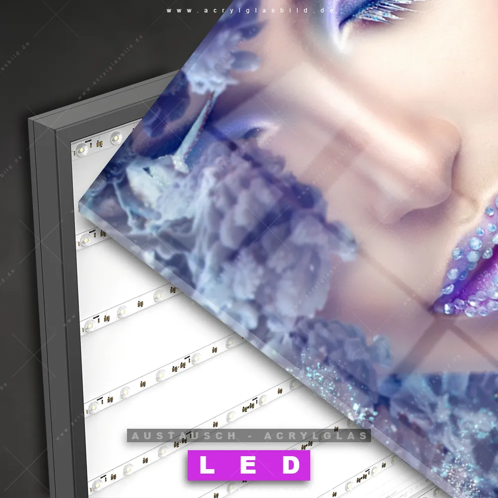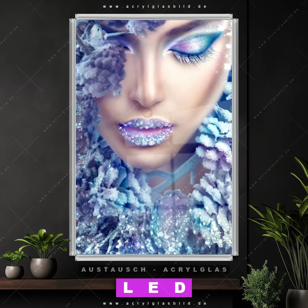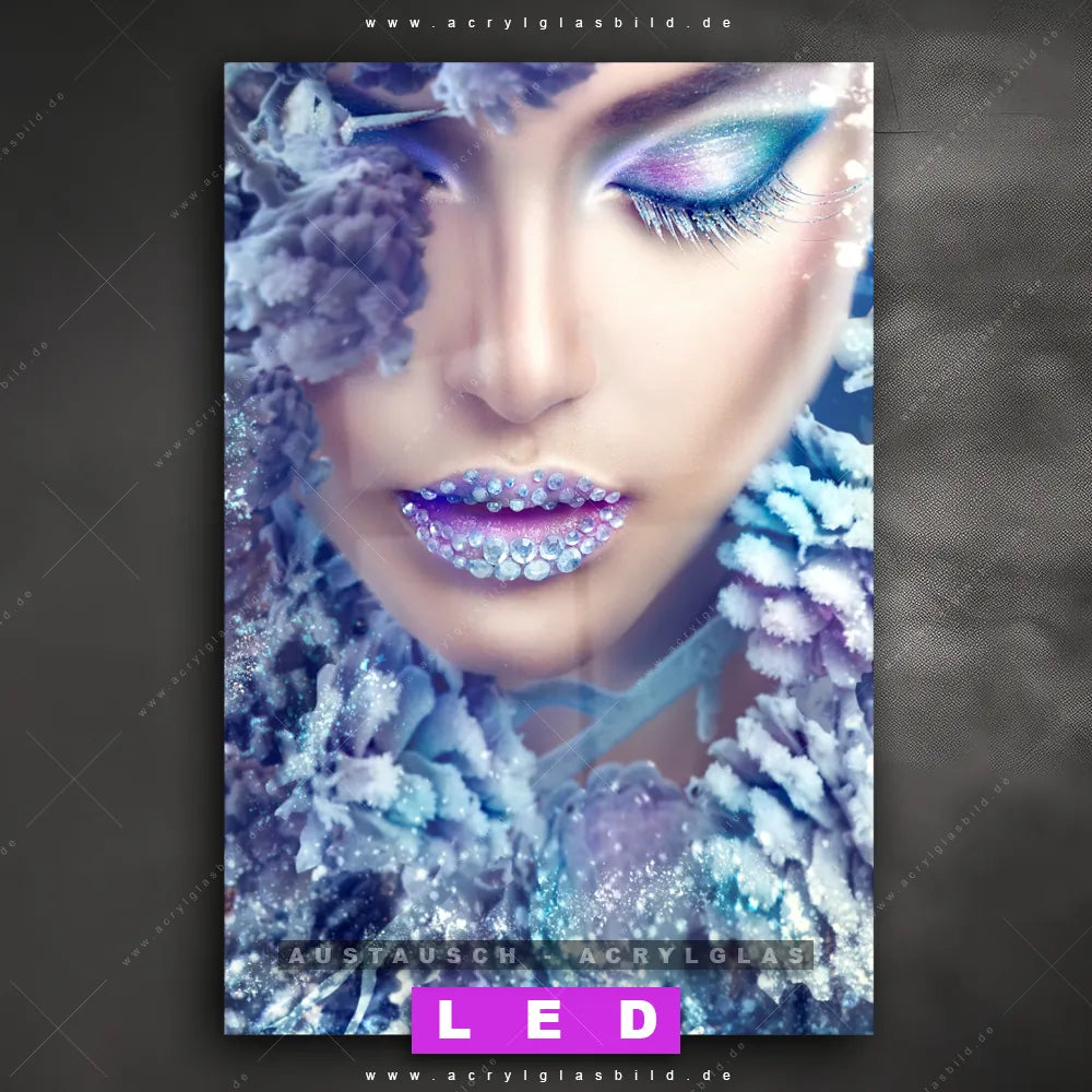 Begriffe wie Frau, Lippen, Mund, Porträt, modern, Beauty, Winter, Schnee, Gesicht, Eiszapfen, Weihnachten, Make-up, Schneeflocken haben dich auf der Suche nach deinem neuen Austausch-Acrylglasbild inspiriert? Dann sollte das Wechsel-Acrylglasbild Eisprinzessin für dein bereits vorhandenes LED Acrylglasbild Canvalight® DIA den Weg zu dir finden.