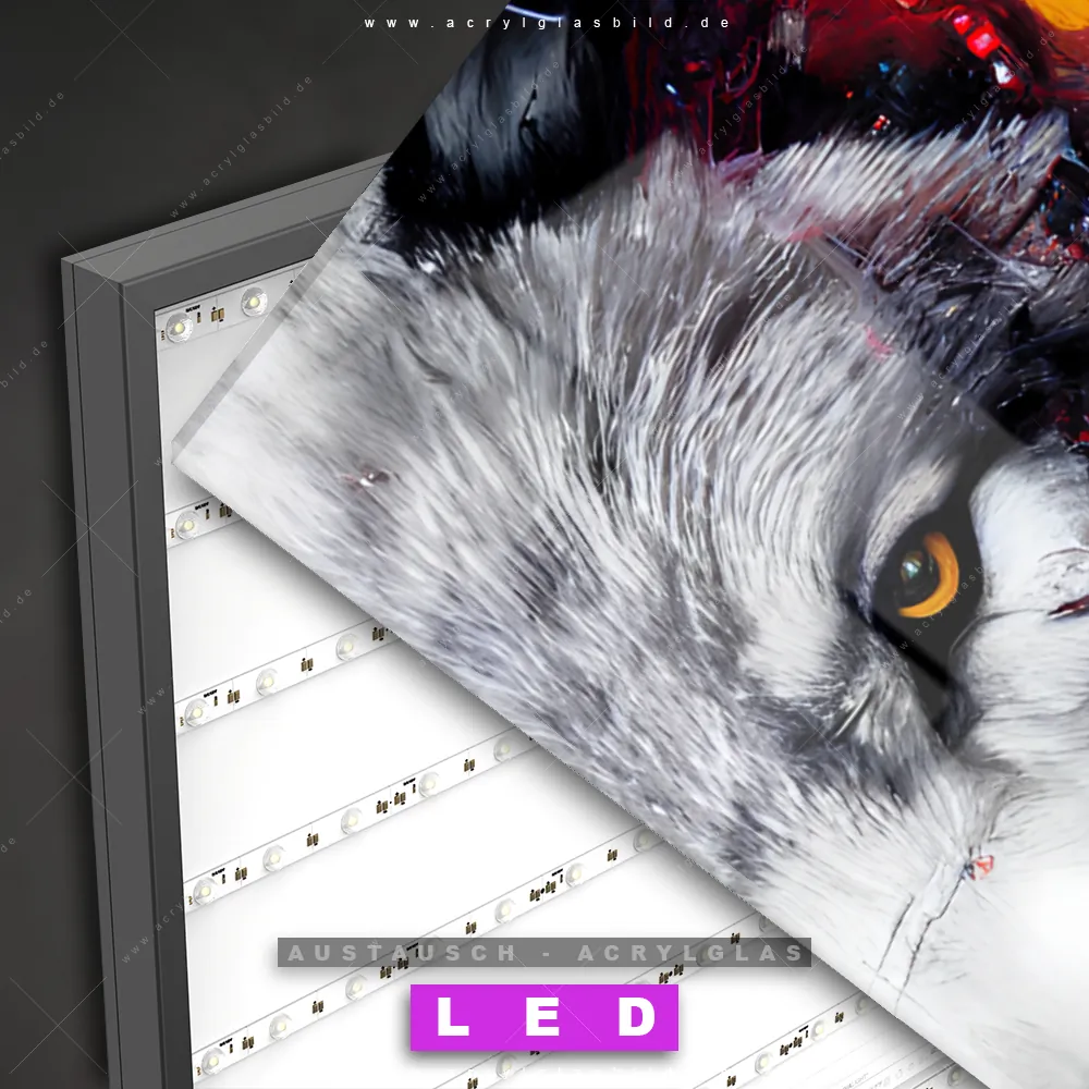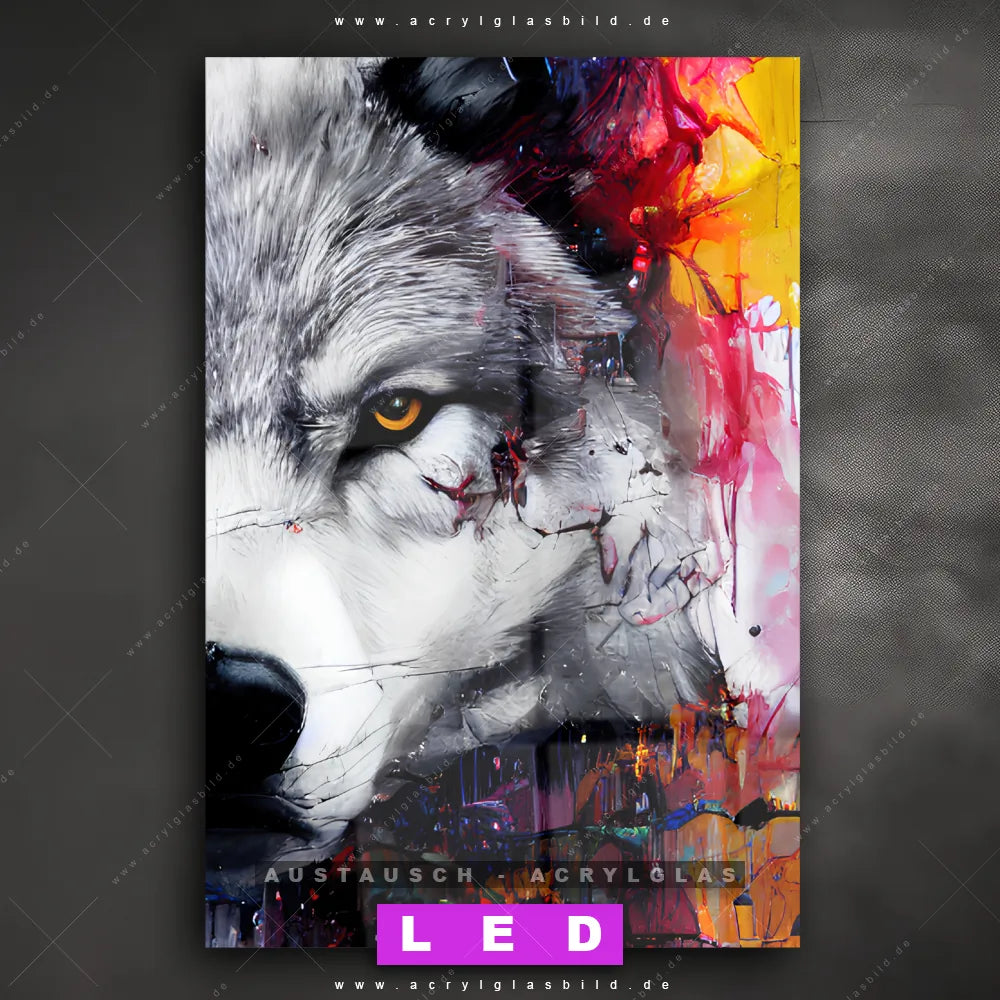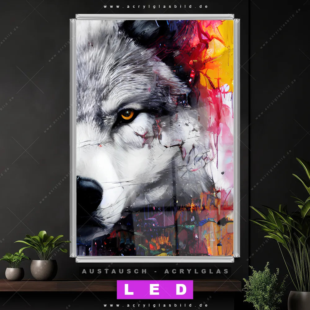 Wechsel-Acrylglas Canvalight® DIA | Wolf mit bunten Farbspritzern | Hochformat