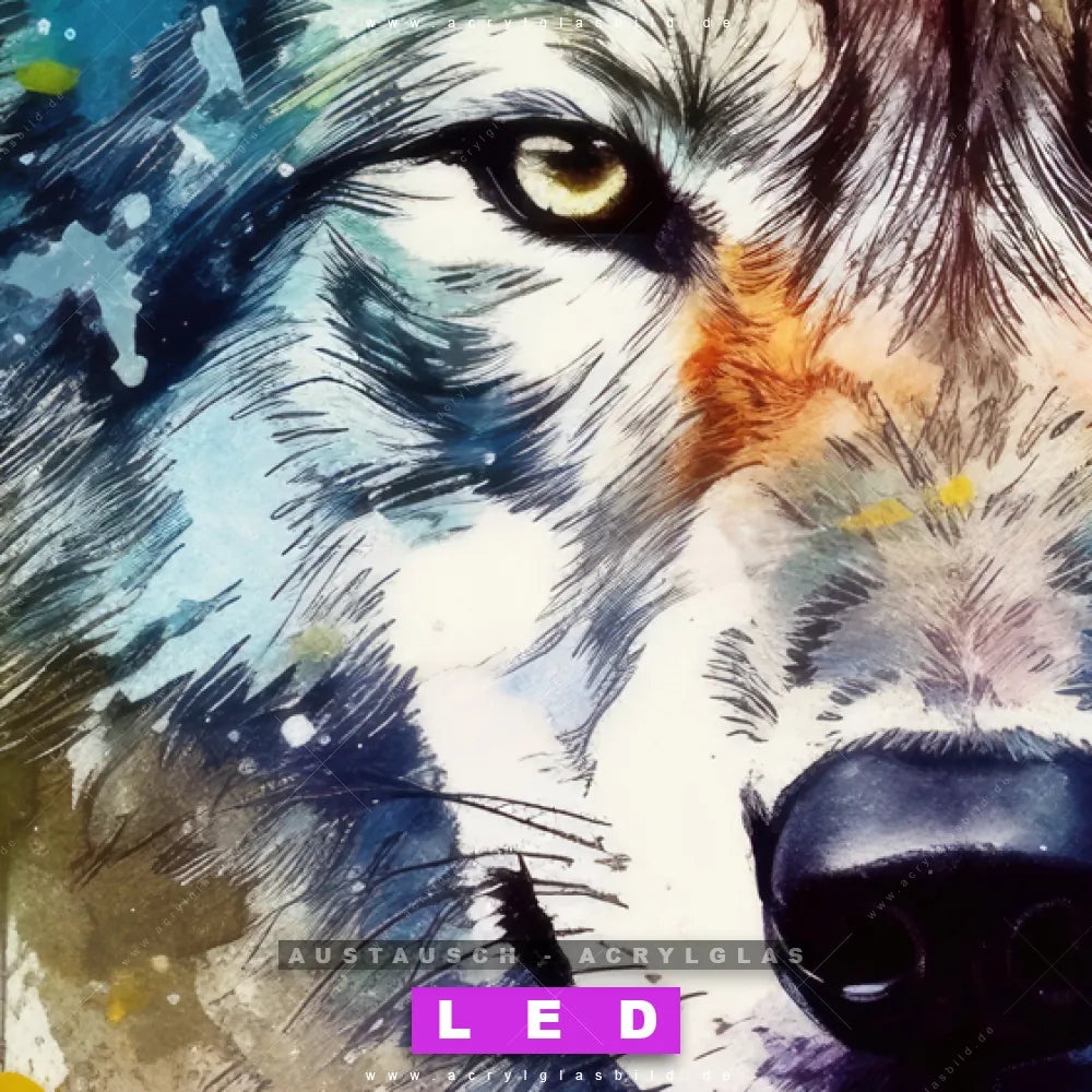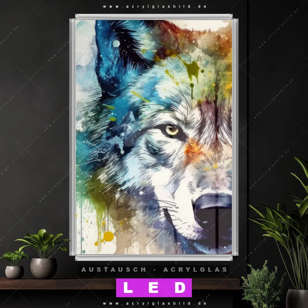 Wechsel-Acrylglas Canvalight® DIA | Wolf mit bunten Farbspritzern No. 2 | Hochformat