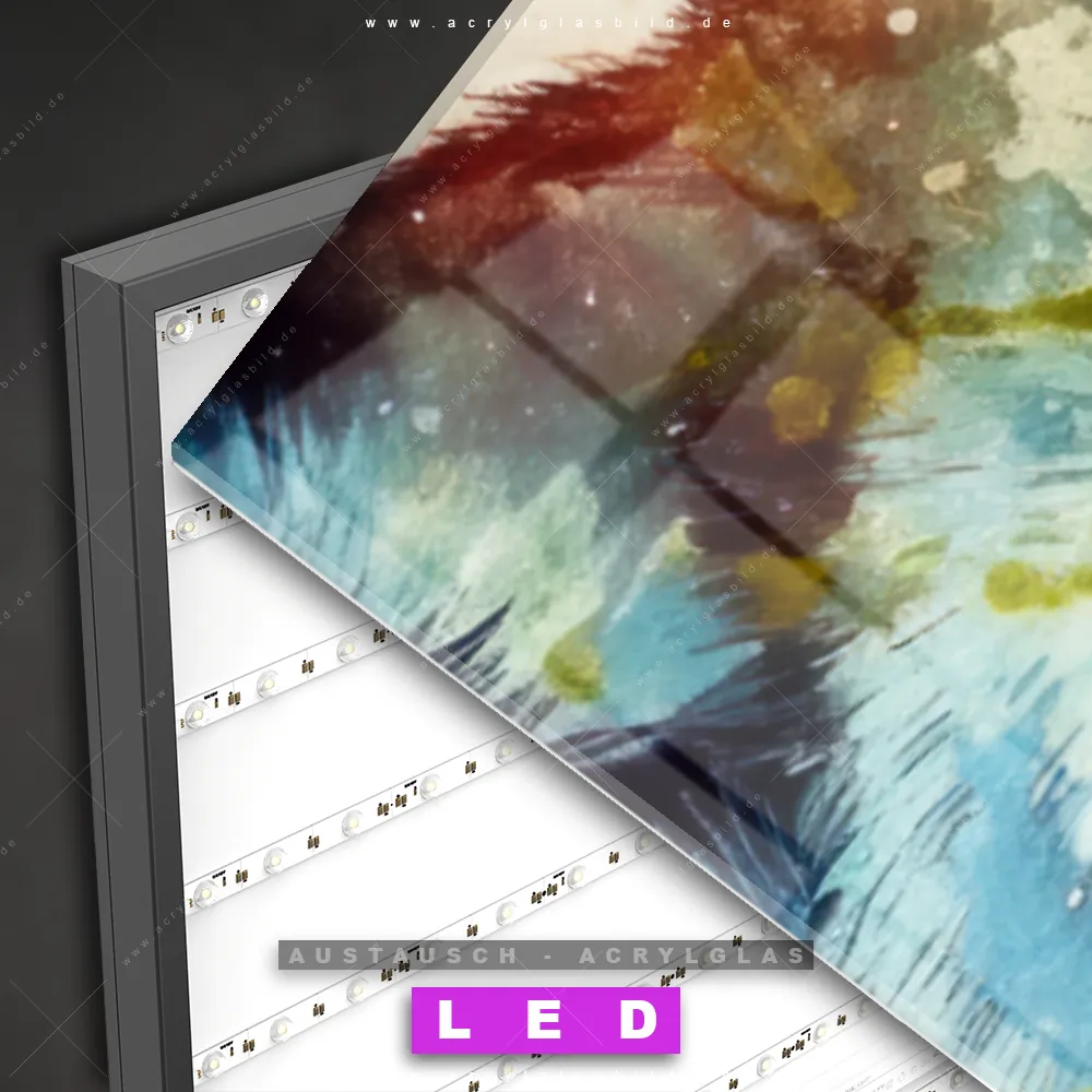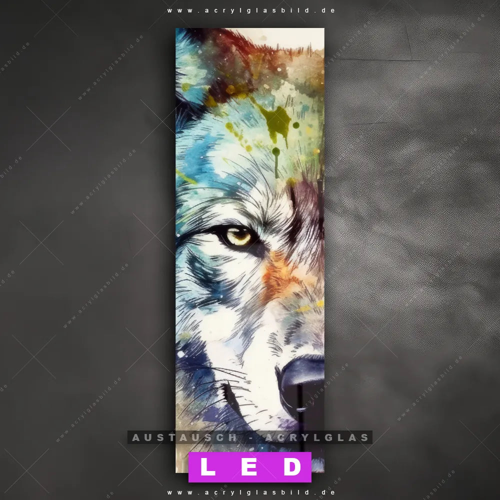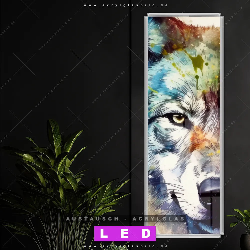 Wechsel-Acrylglas Canvalight® DIA | Wolf mit bunten Farbspritzern No. 2 | Schmal