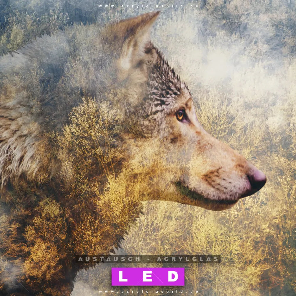 Begriffe wie Wolf, Wald, Doppelbelichtung, Natur, skandinavisch, Bäume haben dich auf der Suche nach deinem neuen Austausch-Acrylglasbild inspiriert? Dann sollte das Wechsel-Acrylglasbild Wolfskopf vor Wald für dein bereits vorhandenes LED Acrylglasbild Canvalight® DIA den Weg zu dir finden.