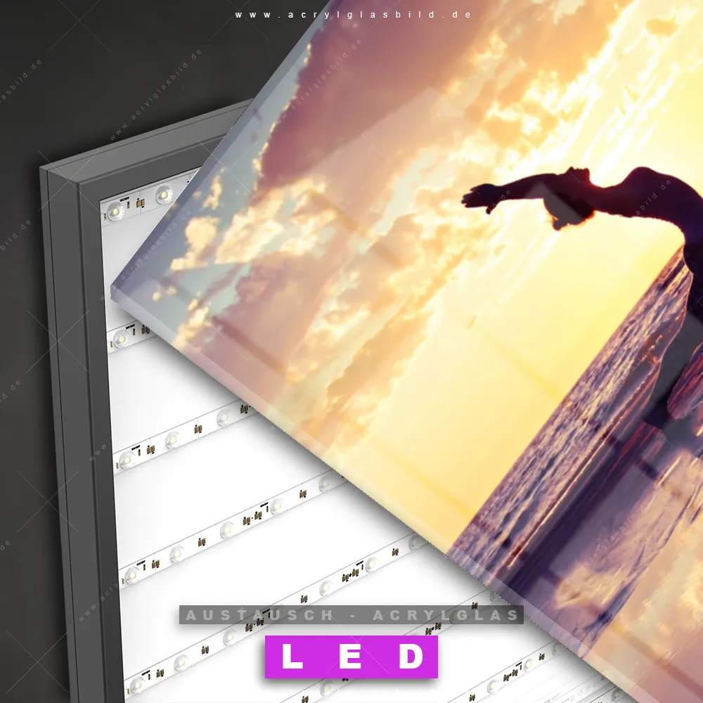 Begriffe wie Meer, Ozean, Wasser, Küste, Horizont, Urlaub, Reisen, Pier, Steg, Sonnenuntergang, Wellen, Strand, Sand haben dich auf der Suche nach deinem neuen Austausch-Acrylglasbild inspiriert? Dann sollte das Wechsel-Acrylglasbild Yoga im Sonnenuntergang für dein bereits vorhandenes LED Acrylglasbild Canvalight® DIA den Weg zu dir finden.