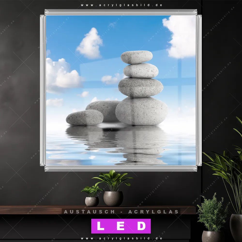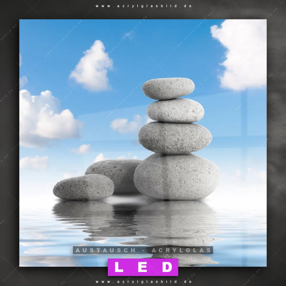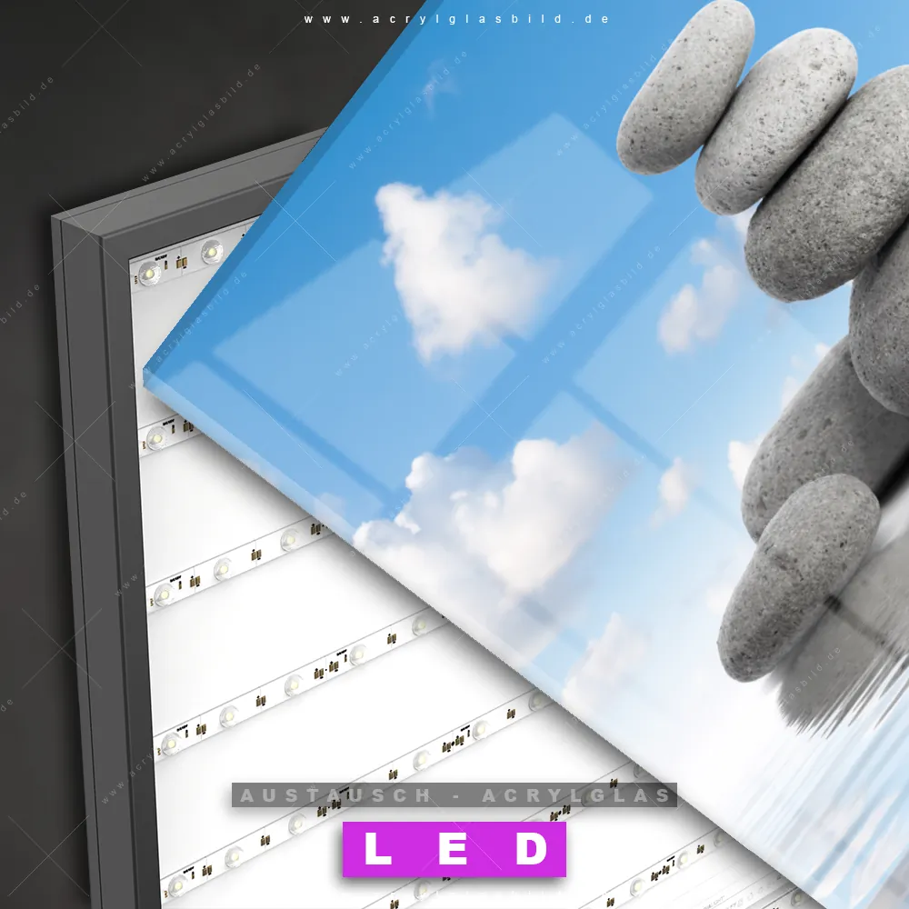 Begriffe wie Buddhismus, Religion, Feng Shui, Zen, Meditation, Steine, Zensteine, Himmel Wolken, Turm, gestapelt, Wasser, Spiegelung, Wasserspiegelung haben dich auf der Suche nach deinem neuen Austausch-Acrylglasbild inspiriert? Dann sollte das Wechsel-Acrylglasbild Zensteine im Wasser mit blauem Himmel für dein bereits vorhandenes LED Acrylglasbild Canvalight® DIA den Weg zu dir finden.